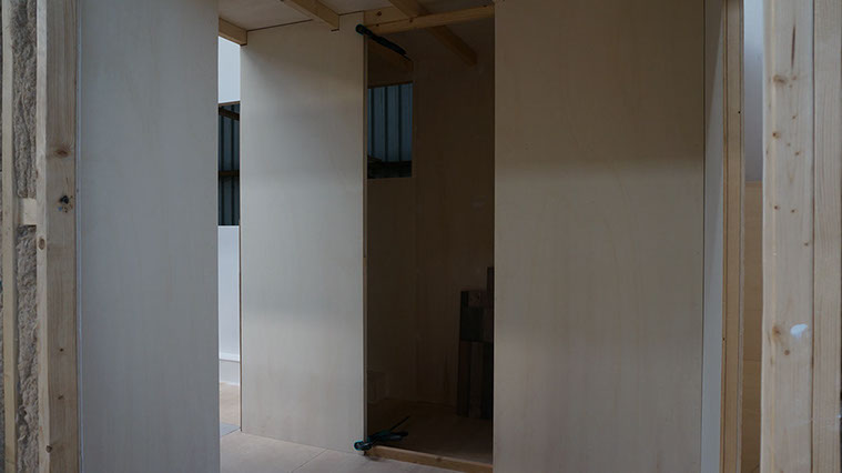 Ik heb bewust gekozen voor een layout waarbij ik binnen het beperkte oppervlak tóch verschillende ruimtes kon creëren: een halletje met toegang tot de badkamer, de trapgang naar de loft en de living met de keuken. En dit alles zonder dat het open karakter verloren gaat. In de doorgang naar de hal vind je een inbouwkast voor kleding met daaronder de koelkast.