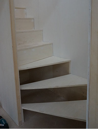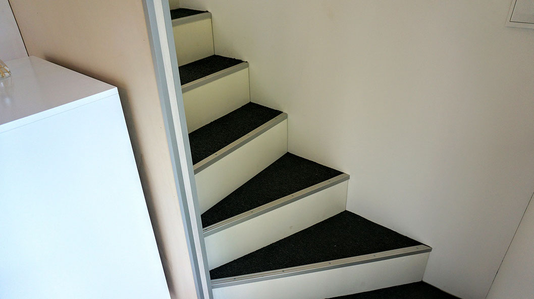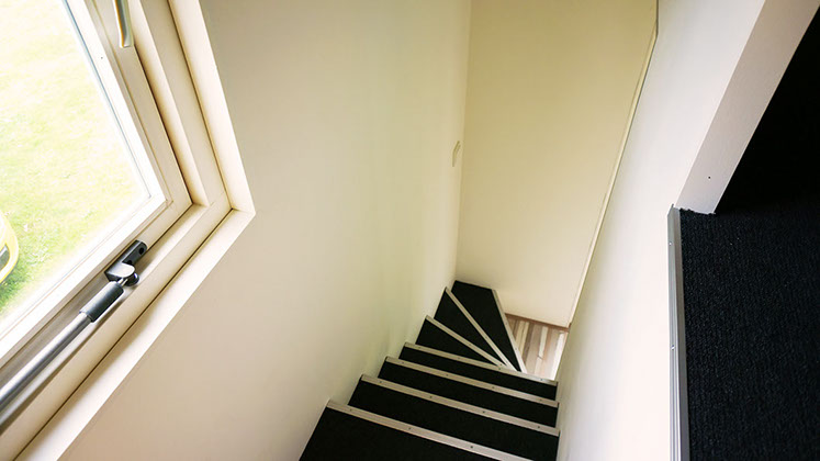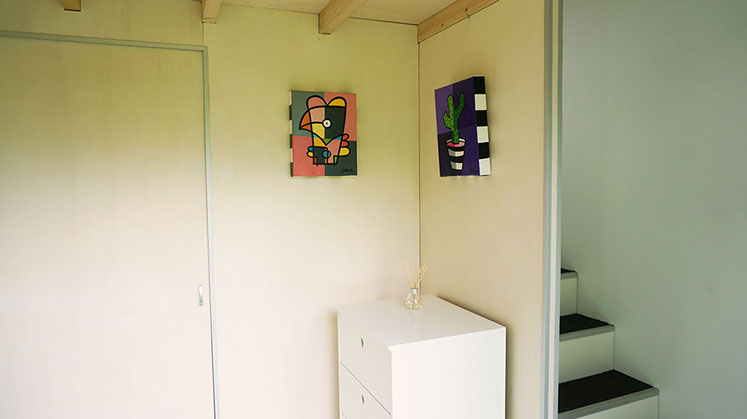 Het halletje is perfect om op je gemak binnen te komen en je schoenen uit te doen en heeft toegang tot de badkamer, de trap naar de loft, enkele kasten en de doorgang naar de living en keuken. De trap is bijzonder omdat de volledige ruimte onder de trap wordt gebruikt als berging. De treden scharnieren omhoog als een deur. Click op de foto's hier links voor meer afbeeldingen daarvan! Onder het plateau bovenaan de trap (de overloop zeg maar) zit een berging die vanaf de buitenzijde toegankelijk is. Kijk maar eens onder de trap voordat we naar de loft gaan! Het leuke kastje trouwens, vond ik bij Jysk!