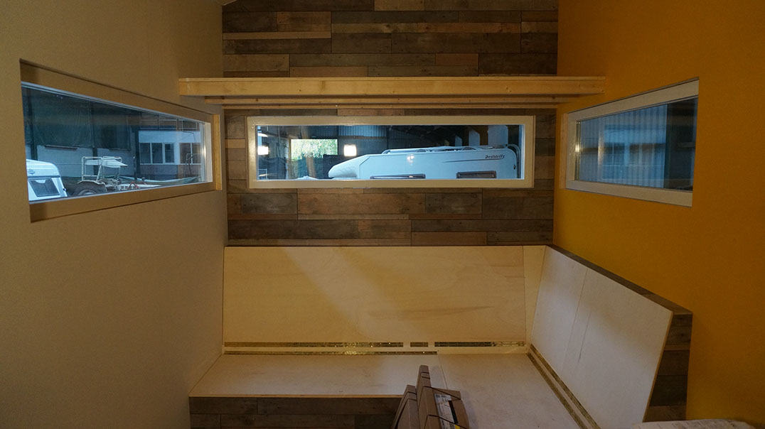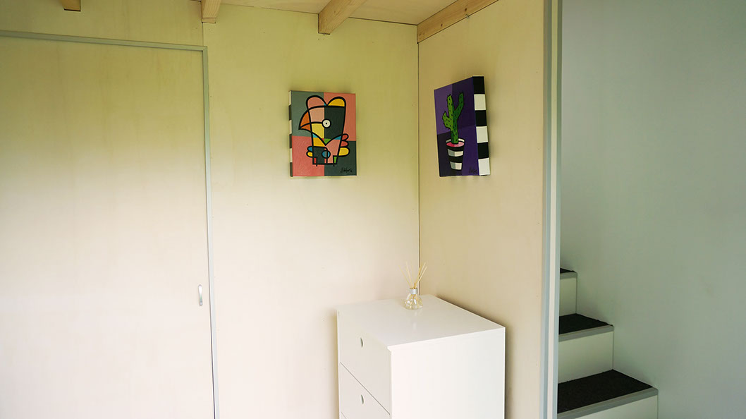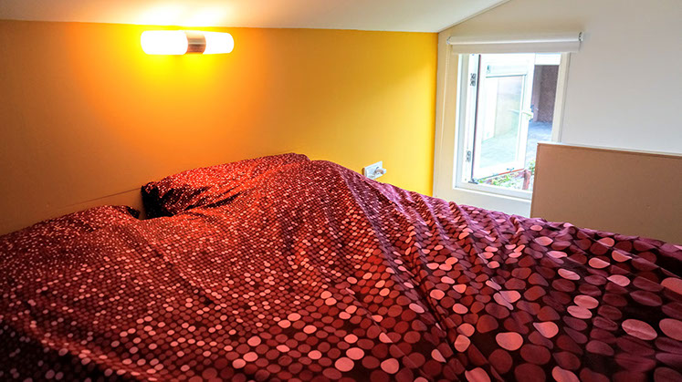 De loft is ideaal! Al vanaf het begin van het ontwerpproces vond ik het belangrijk dat ik in mijn huisje nergens mijn hoofd zou stoten of capriolen uit zou moeten halen om bijvoorbeeld mijn bed op te maken. Dit is de reden waarom mijn dak relatief vlak is (een helling van slechts 20 graden). Dan kan ik met gemak nog bij het voeteneinde om het bed te verschonen. Rechtop zitten op bed is ook geen probleem want de loft is 1,15m hoog. De breedte is 2,15m. Dus naast een matras van 1,60m hou ik nog ruimte over voor bijvoorbeeld kledingopbergers.